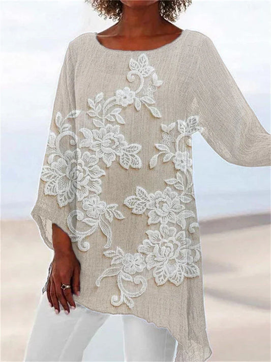 Vintage λινό blend τουνίκ κεντημένο με φλοράλ δαντέλα