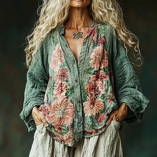 Γυναικείο μακρυμάνικο λινό πουκάμισο με μποέμ φλοράλ στάμπα