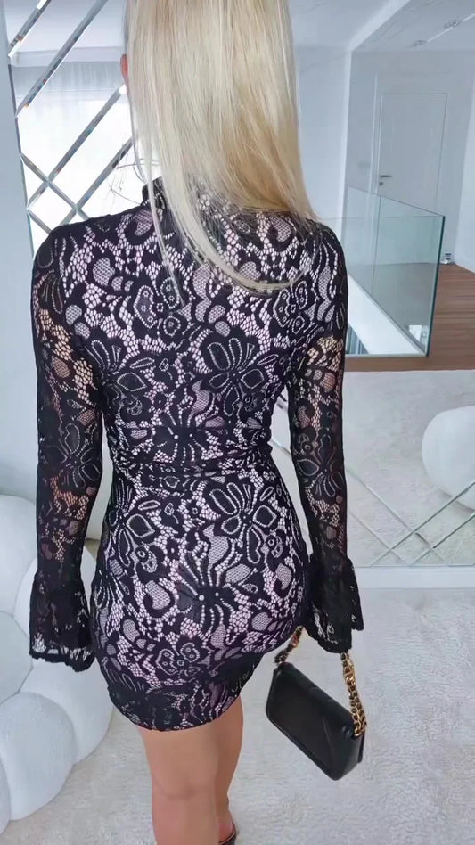 Γυναικείο φόρεμα από δαντέλα με ανοιχτή ύφανση και ψηλό γιακά