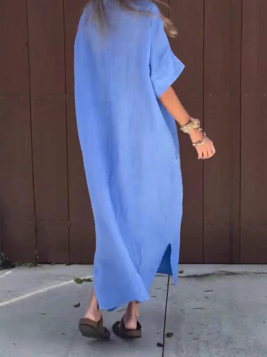 Κομψό μάξι φόρεμα από λινό με κεντημένη φλοράλ δαντέλα