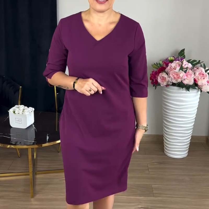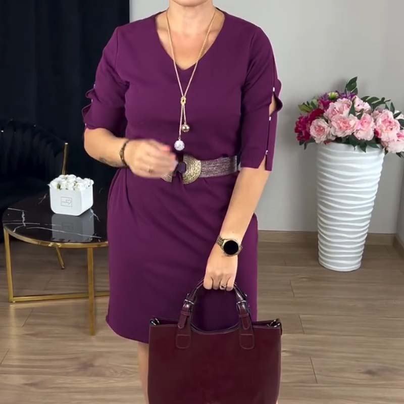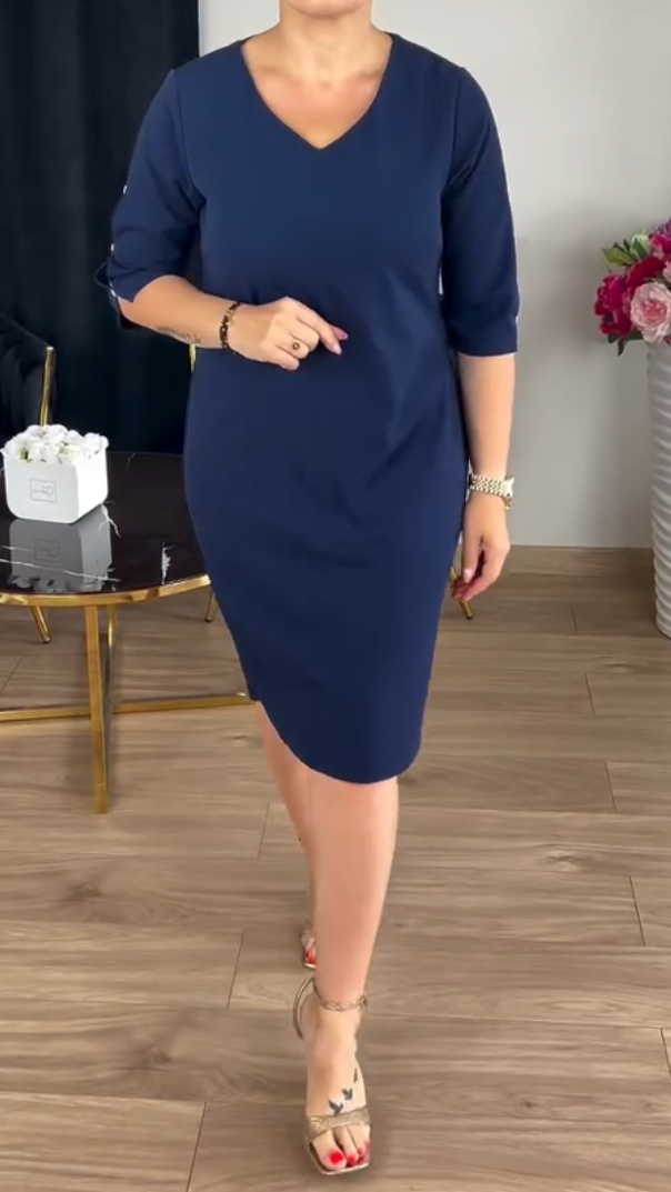 Κομψή λαιμόκοψη σε σχήμα V – Αυτό το φόρεμα διαθέτει εφαρμοστό λαιμόκοψη σε σχήμα V που τονίζει την κλείδα και το άνω ντεκολτέ, δημιουργώντας μια εκλεπτυσμένη και θηλυκή σιλουέτα. Το καθαρό κόψιμο αναδεικνύει τις φυσικές γραμμές διατηρώντας παράλληλα την απλότητα, καθιστώντας το εύκολο να φορεθεί με κολιέ, φουλάρι ή κομμάτια σε στρώσεις. Η ευέλικτη λαιμόκοψη σε σχήμα V είναι ιδανική για casual ή πιο επίσημες περιστάσεις χωρίς να φαίνεται υπερβολικά εντυπωσιακή.