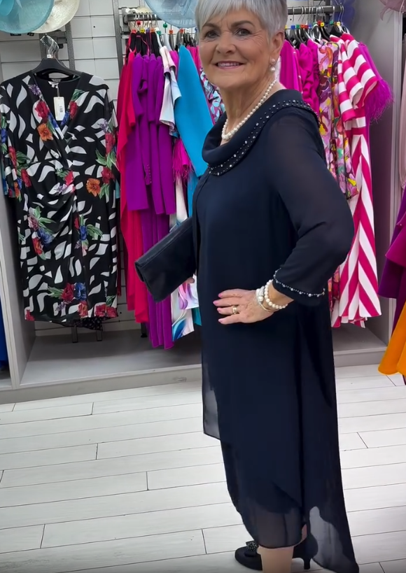 Αυτό το κομψό μίντι φόρεμα αποπνέει κομψότητα και φινέτσα. Η κλασική στρογγυλή λαιμόκοψη τονίζει το ντεκολτέ και δημιουργεί μια κομψή σιλουέτα. Τα μακριά μανίκια πλαισιώνουν τέλεια τα χέρια και προσθέτουν μια πινελιά κομψότητας.