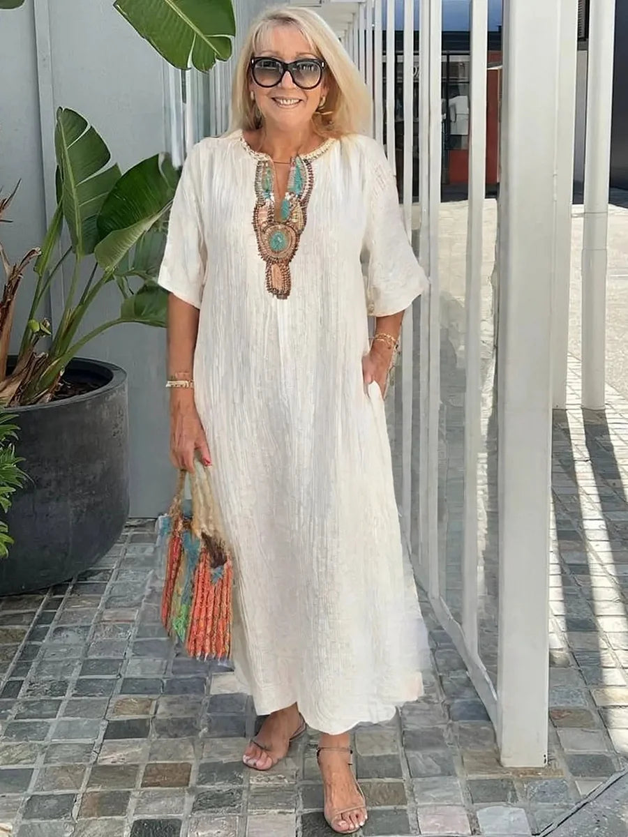 [S-4XL]🌿 Φόρεμα με φαρδιά γραμμή και κέντημα από βαμβάκι και λινό