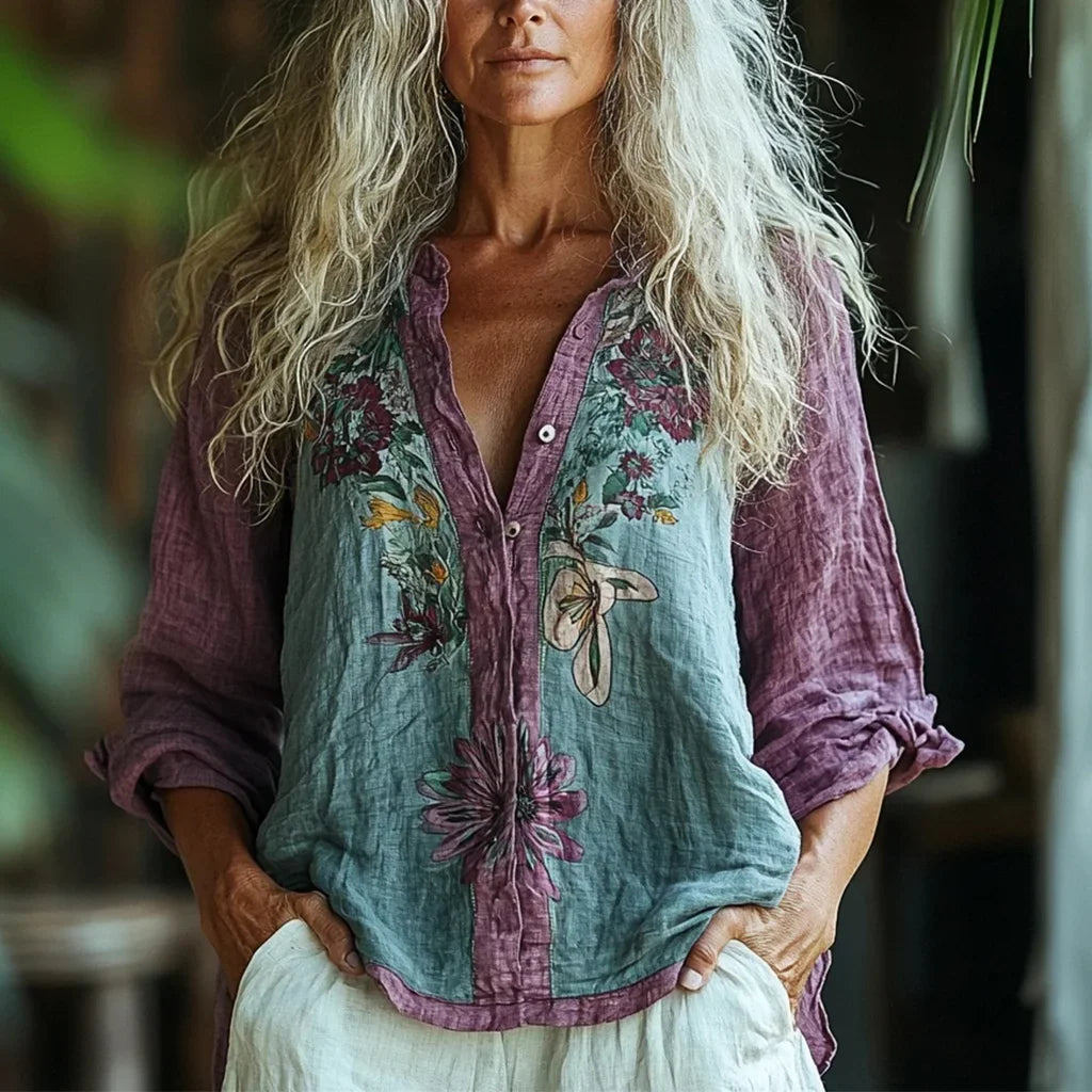 Γυναικείο μακρυμάνικο λινό πουκάμισο με μποέμ φλοράλ στάμπα