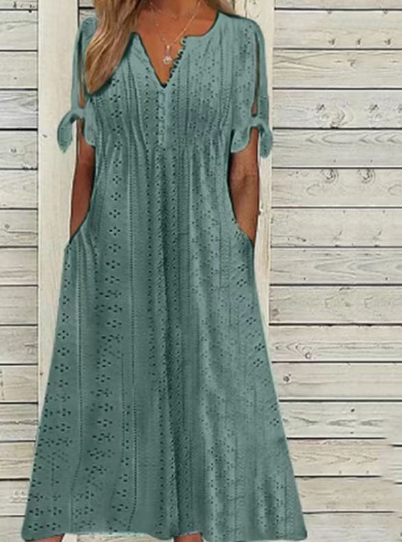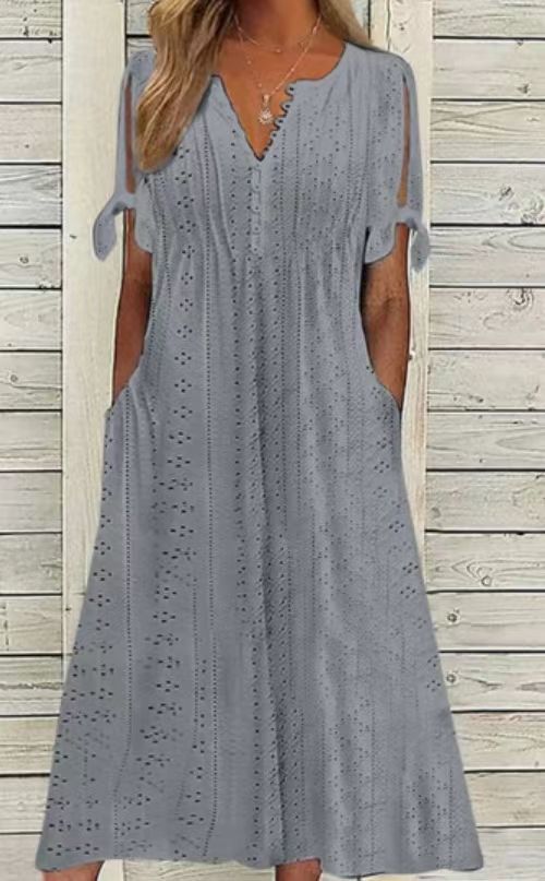 Αναπνεύσιμο, εύκολο στη φροντίδα ύφασμα - Κατασκευασμένο από ελαφρύ ύφασμα σχεδιασμένο για αναπνοή και εύκολη φροντίδα, αυτό το φόρεμα προσφέρει άνεση και πρακτικότητα. Η κατασκευή του υφάσματος προωθεί την κυκλοφορία του αέρα και επιταχύνει τις ρουτίνες φροντίδας, ιδανικό για όσους αναζητούν κομψά ρούχα με ελάχιστη συντήρηση.
