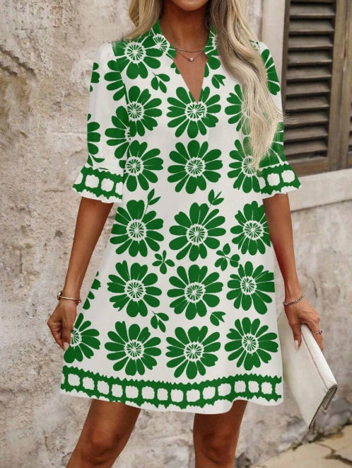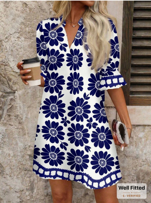 Μπλε και άσπρο φόρεμα με τυπωμένα σχέδια για θέρετρο