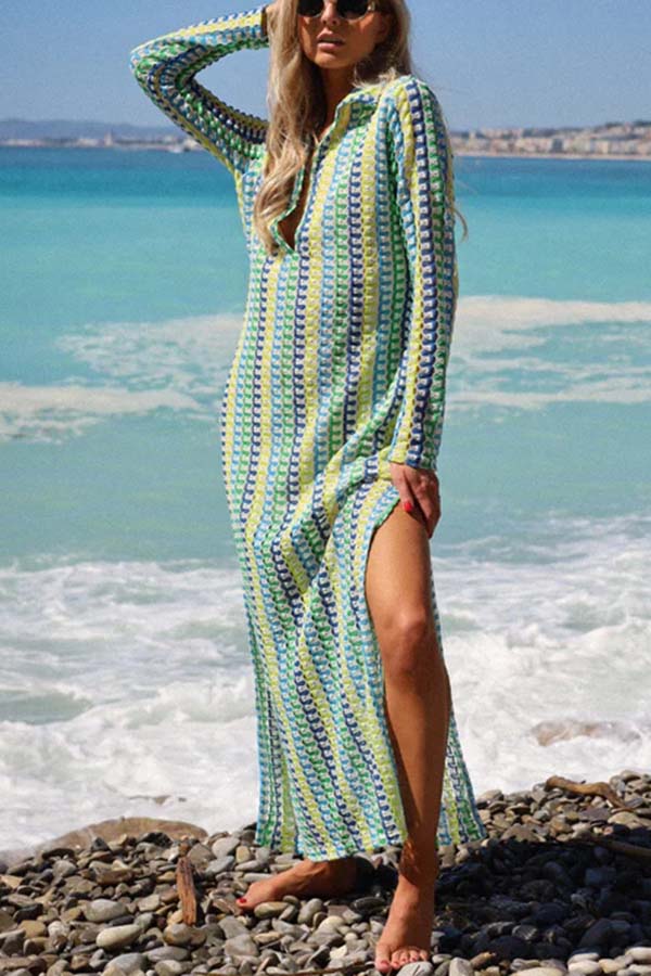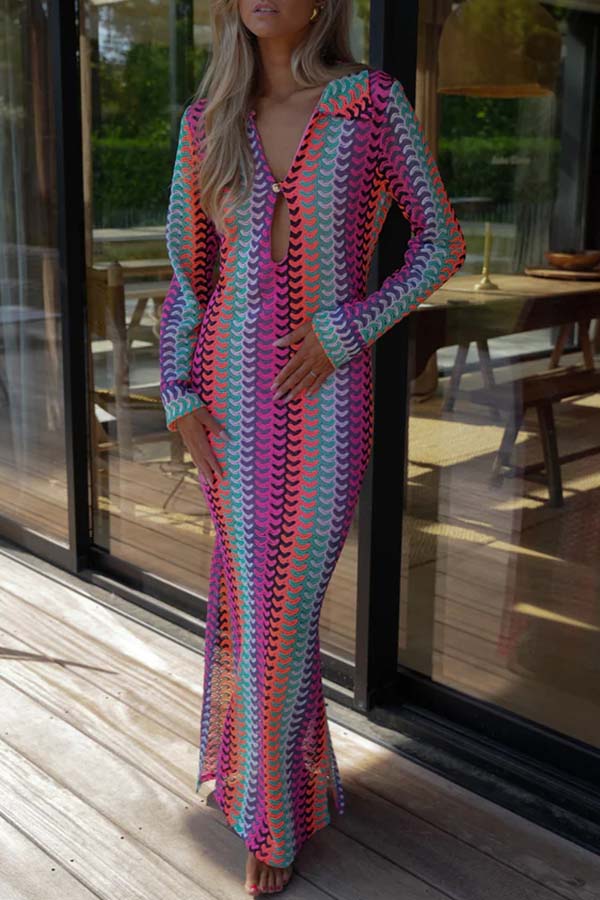 Μακρύ πλεκτό φόρεμα με αποκλειστικό τύπωμα και σκίσιμο με μακριά μανίκια