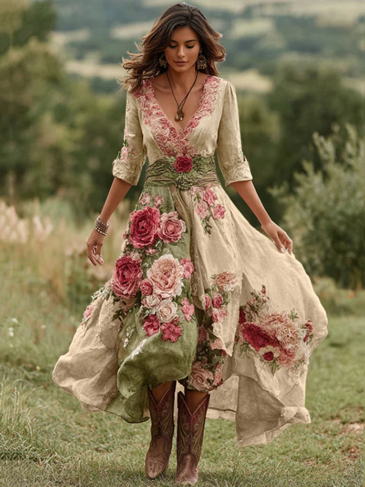 Γυναικείο vintage φόρεμα με φλοράλ ντεκολτέ και V λαιμόκοψη από λινό μείγμα 2025