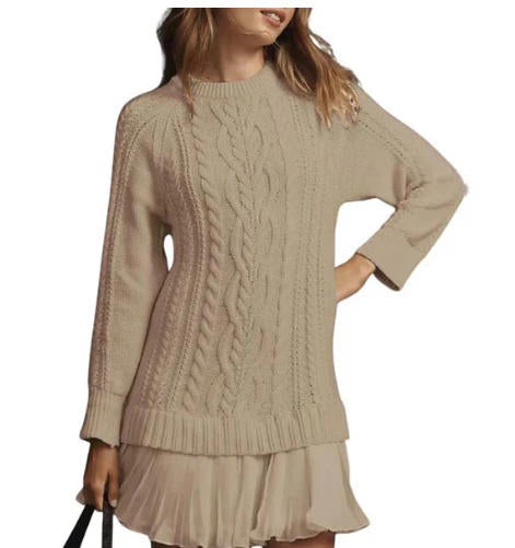 Το πάνω μέρος αυτού του φορέματος είναι κατασκευασμένο από ένα κλασικό χοντρό πλεκτό με σύνθετη ύφανση, προσφέροντας ζεστασιά και στυλ τις πιο κρύες μέρες. Ο διαχρονικός σχεδιασμός προσθέτει υφή και κομψότητα σε αυτό το ευέλικτο φόρεμα.