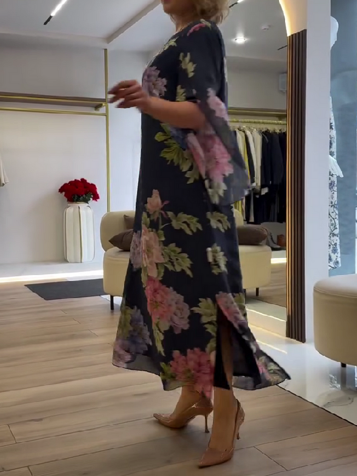 Αυτό το μοναδικό φλοράλ μάξι φόρεμα είναι η τέλεια προσθήκη στην καλοκαιρινή σας γκαρνταρόμπα. Το έντονο φλοράλ print και τα μακριά κοντά μανίκια το καθιστούν κομψό, άνετο και κομψό. Φτιαγμένο με υφάσματα υψηλής ποιότητας, είναι ο τέλειος συνδυασμός στυλ και πρακτικότητας. Μην χάσετε αυτό το must-have φόρεμα!