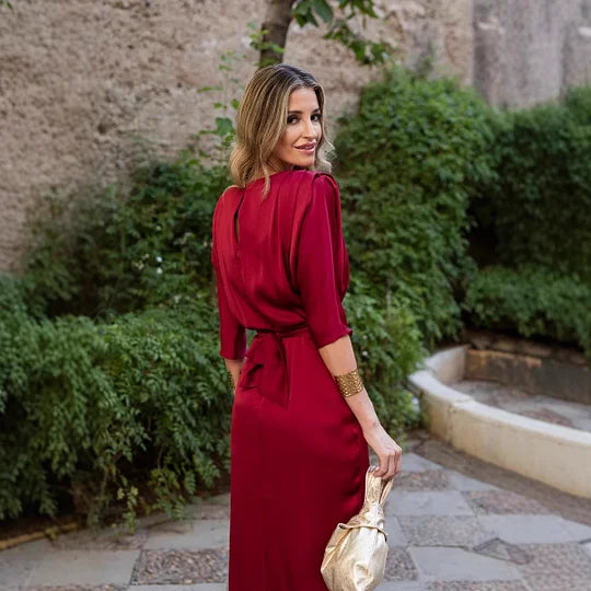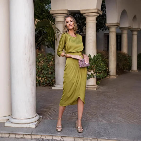 Σατέν μίντι φόρεμα με στρογγυλή λαιμόκοψη και κοντά μανίκια, μονόχρωμο