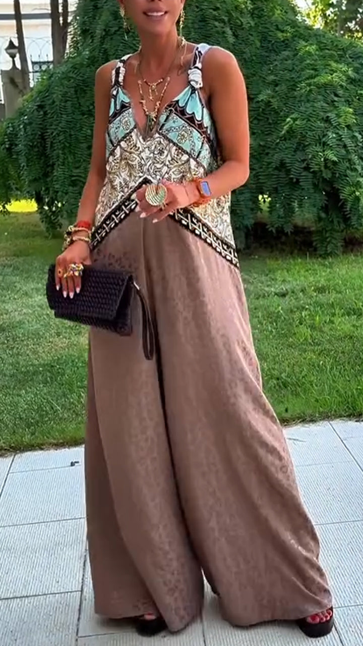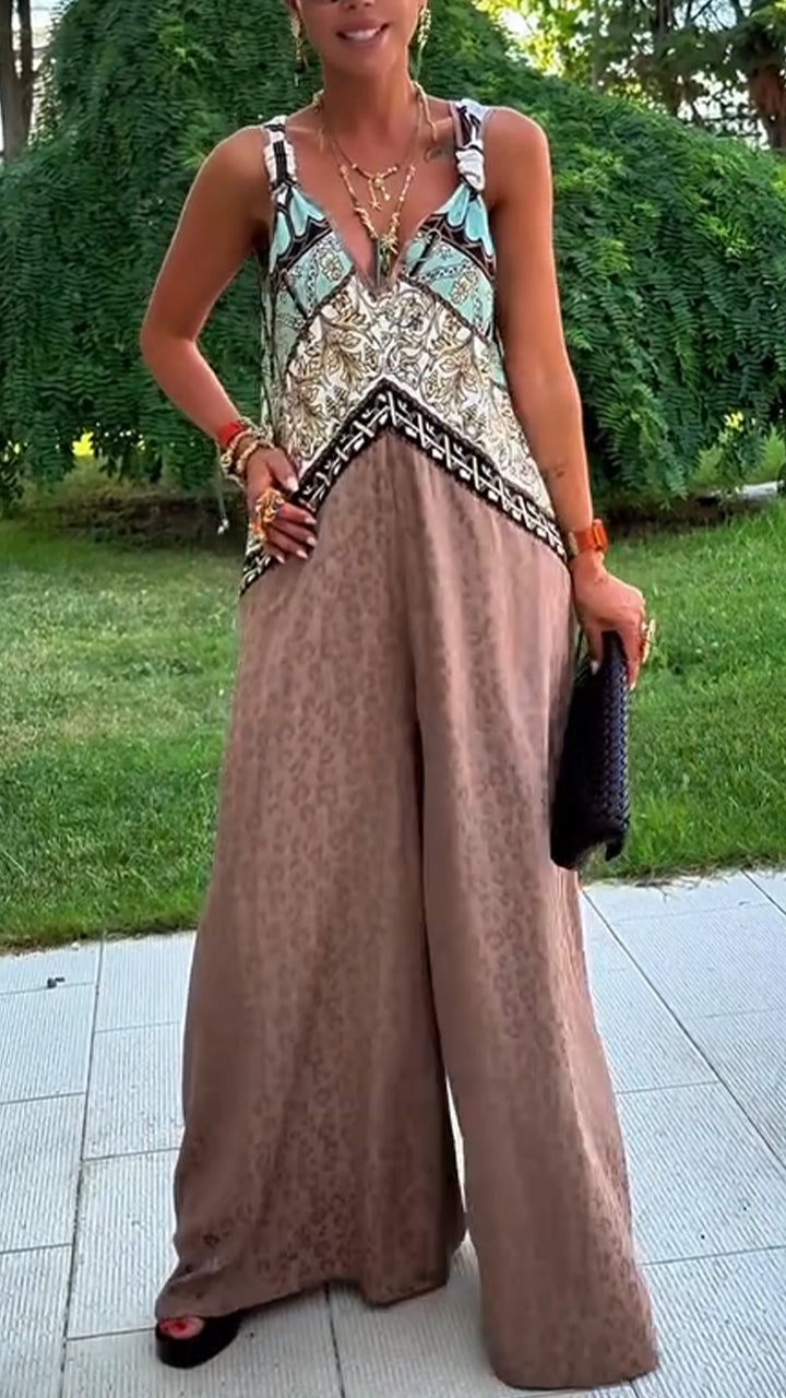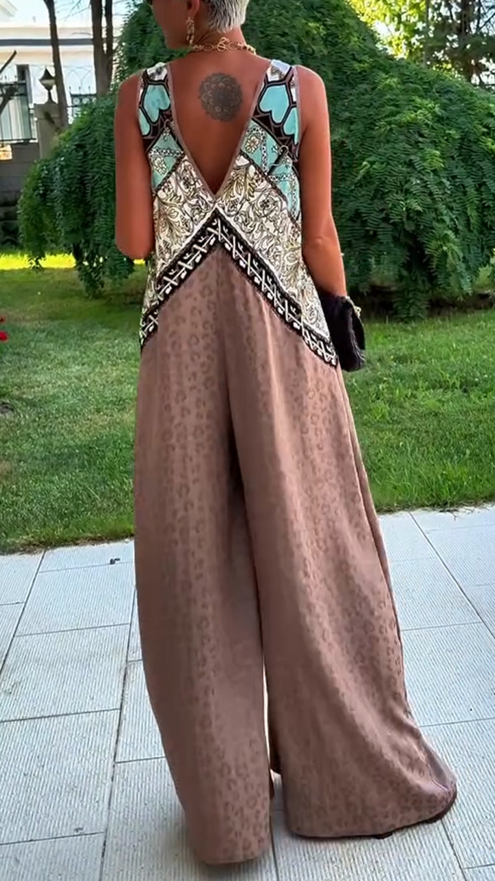 Γυναικεία χαλαρή, casual ολόσωμη φόρμα με V λαιμόκοψη και στάμπα Patchwork